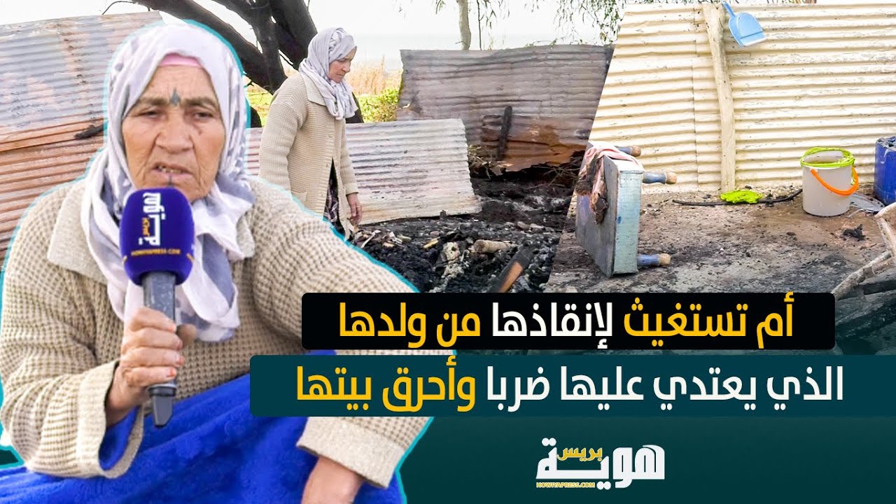 شاهد.. أم تستغيث لإنقاذها من ولدها الذي يعتدي عليها ضربا وأحرق بيتها