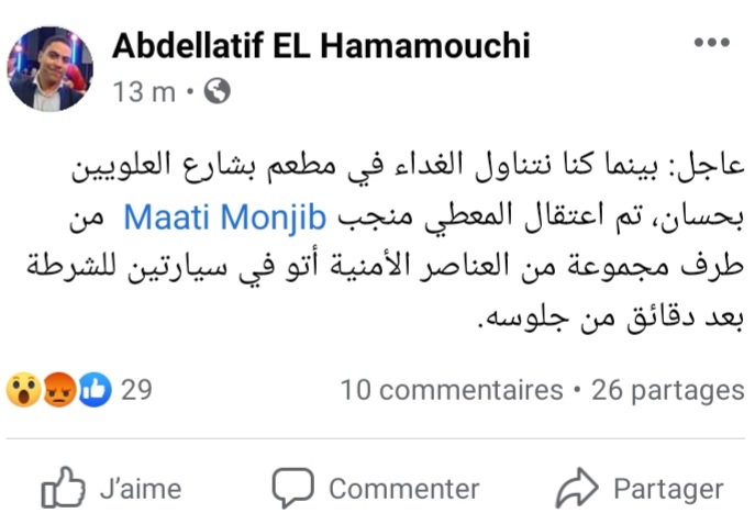 وذكر عبد اللطيف الحماموشي، في تدوينة على “فيسبوك”، إن منجب اعتقل من طرف مجموعة من العناصر الأمنية بشارع العلويين بحسان الرباط، وأكد الحماموشي أنه تم إيقاف منجب أثناء تناوله لوجبة الغذاء في مطعم بشارع العلويين بحسان”.