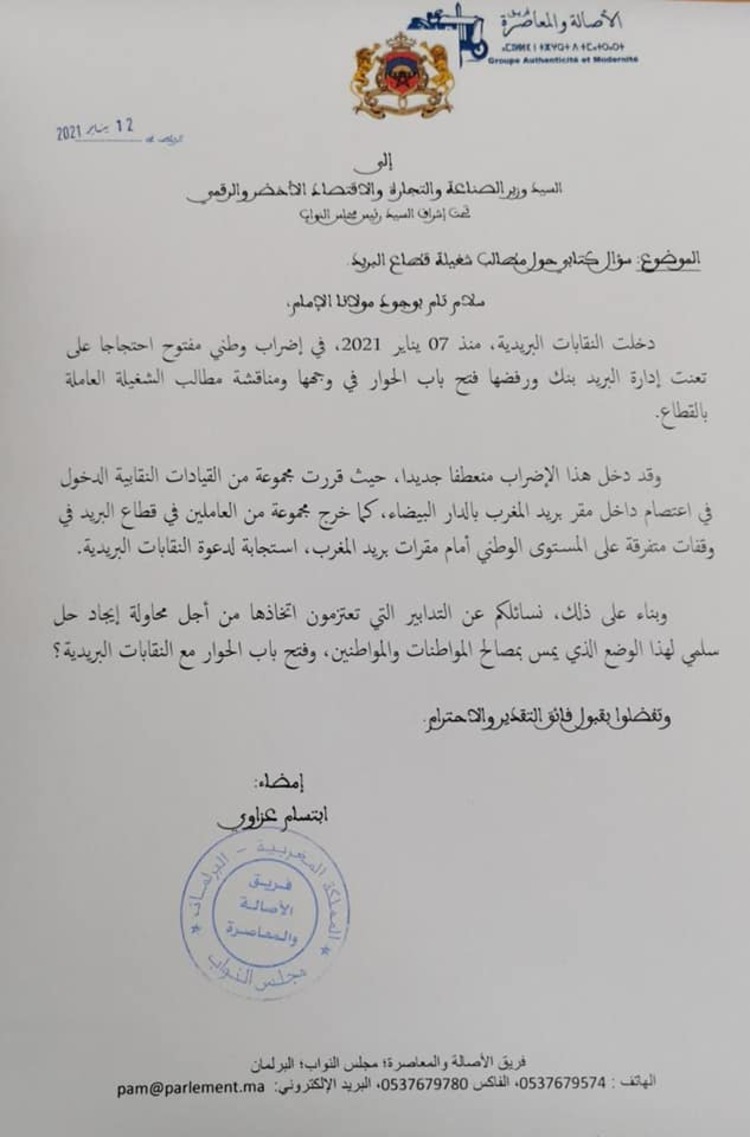 وفي ظل هذا الاحتقان الذي يعرفه قطاع البريد، وجهت ابتسام عزاوي، النائبة البرلمانية عن حزب الأصالة والمعاصرة، اليوم الثلاثاء، سؤالا كتابيا لوزير الصناعة والتجارة والاقتصاد الأخضر والرقمي.
