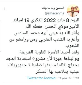 كتب الحسن ولد ماديك، الفقيه الموريتاني المتخصص في علم القراءات، تغريدة على حسابه ب”تويتر”، يوم أمس الأحد، بمناسبة حلول الذكرى 19 لميلاد ولي العهد الأمير مولاي الحسن.