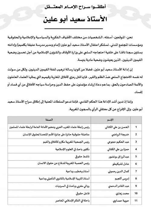 وجاء في التقديم لهاته العريضة “نحن الموقعين أسفله، الشخصيات من مختلف الأطياف الفكرية والسياسية والإعلامية والحقوقية ومؤسسات المجتمع المدني، نستنكر اعتقال الأستاذ سعيد أبو علين (إمام ومدير مدرسة عتيقة بكلميم) وإدانته بسنتين سجنا نافذا على خلفية احتجاجه السلمي على وزارة الأوقاف والشؤون الإسلامية من أجل تحسين وضعية القيمين الدينيين، الذين يعيشون وضعية مادية بئيسة”.