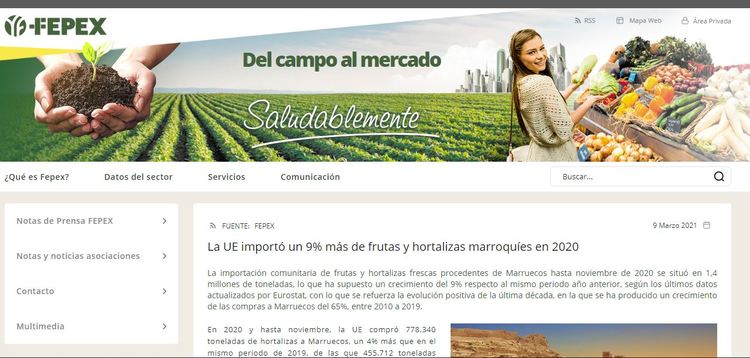 وكشفت الفيدرالية الإسبانية، في بيان نشرته على موقعها الإلكتروني الرسمي، أن الصادرات المغربية من الخضر والفواكه نحو الاتحاد الأوروبي حققت ارتفاعا ما بين سنتي 2010 و2019 بلغت نسبته 65 بالمئة، حيث انتقل حجمها من 856 ألفا و919 طنا إلى 1.4 مليون طن.