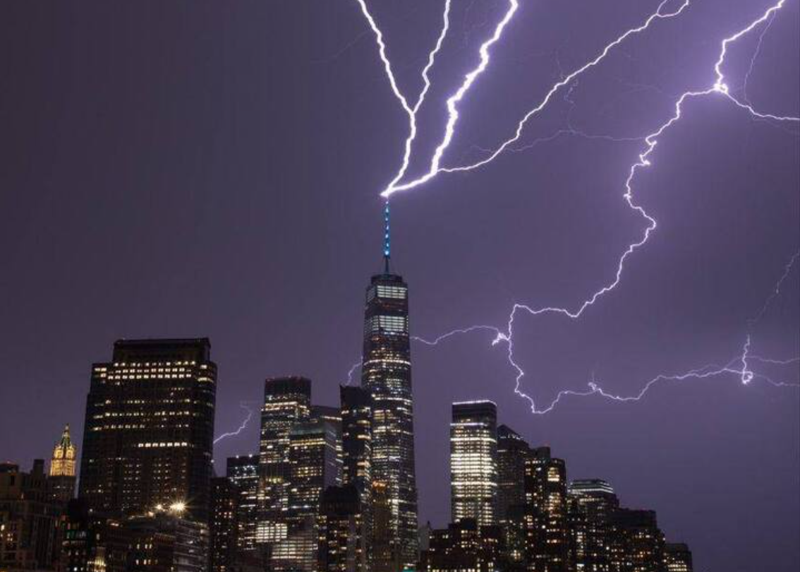ضرب البرق مركز التجارة العالمي في نيويورك، وهو أطول مبنى في نصف الكرة الغربي بالولايات المتحدة الأمريكية.