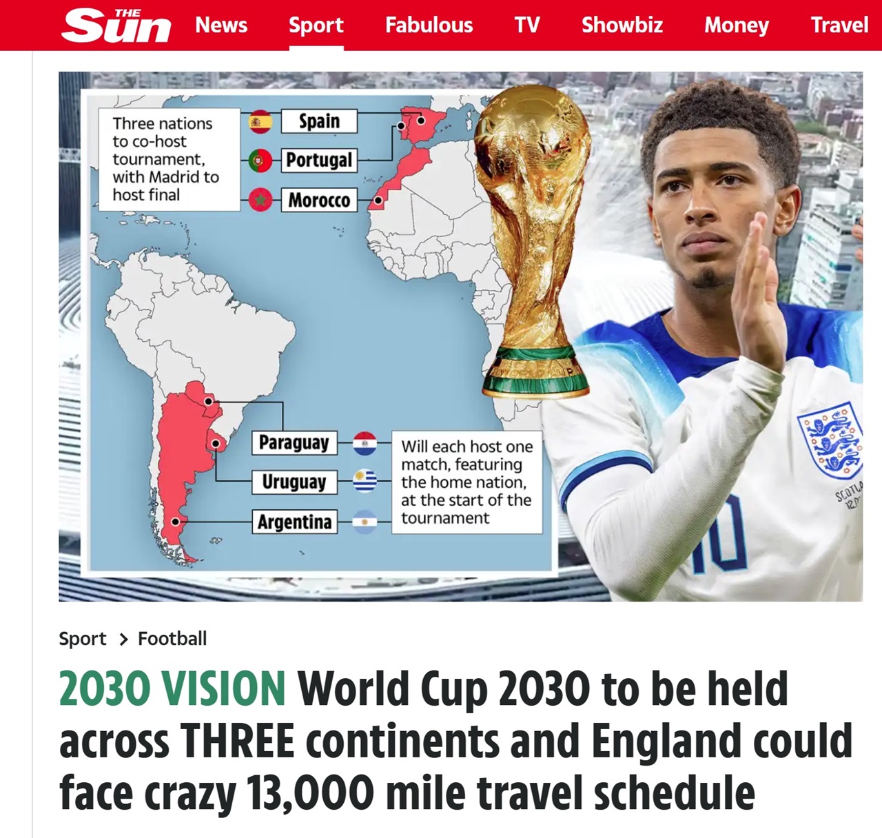 تضمن الخبر الذي أوردته الصحيفة البريطانية العالمية “The sun” عن احتضان كأس العالم 2030 في ثلاث قارات، صورة خريطة المملكة المغربية كاملة على غلاف الصفحة الرئيسية.
