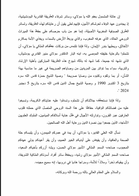 الرسالة تحدثت بإسهاب عن ما وصفته بـ”الانحراف عن وصية الشيخ الراحل”، حيث أكدت أن هناك أطرافاً داخل البيت البودشيشي تحاول الاستئثار بالقيادة الروحية للزاوية عبر ادعاءات لا أساس لها من الشرعية، وهو ما اعتبرته الأسرة ضرباً لإرث روحي بناه الشيخ الراحل لعقود طويلة. كما شددت المراسلة على أن وصية جمال الدين القادري واضحة وصريحة، وتنص على أن الخلافة الروحية يجب أن تكون في يد أحد أبنائه الشرعيين، حفاظاً على ما أسمته “نقاء السلسلة البودشيشية”.