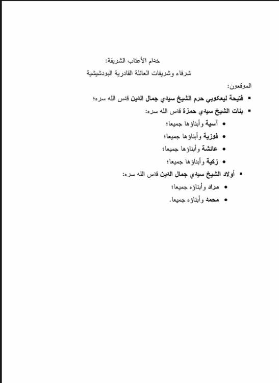 وقد وقّع الرسالة كل من الدكتور منير القادري بودشيش، والدكتور زهير القادري بودشيش، وعبد الصمد القادري بودشيش، إضافة إلى السيدة فاطمة الزهراء القادري بودشيش، إلى جانب عدد من أبناء وأحفاد الشيخ، ممن أكدوا أنهم حريصون على صون وصية والدهم الراحل وتماسك البيت البودشيشي.