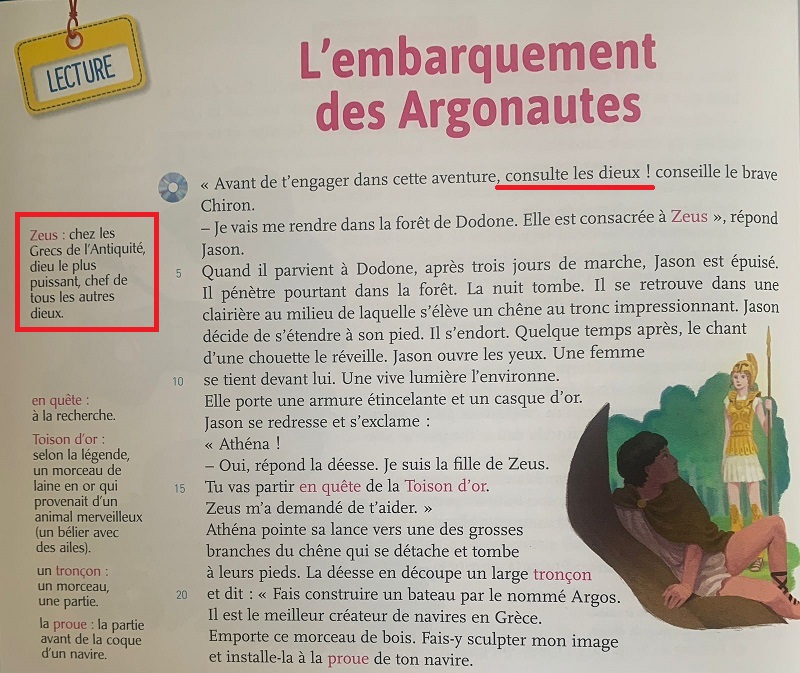 النص المثير هذه المرة حمل عنوان: صعود الأرجونوتس L’embarquement des argonautes، وتعود قصته ومضامينه لأساطير الإغريق الموغلة في الشرك بالله تعالى وتعدد الآلهة والخرافة والدجل.