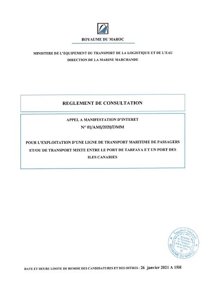 أعلنت وزارة التجهيز والنقل واللوجستيك والماء، عن إطلاق دعوة للتعبير عن الاهتمام من أجل تشغيل خط بحري للنقل المختلط (ركاب وسلع) بين ميناء طرفاية وأحد موانئ جزر الكناري، ويأتي ذلك في إطار سعيها لتعزيز الربط البحري انطلاقا من الموانئ المغربية.