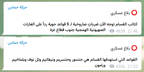 وقالت كتائب عز الدين القسام في بيان عبر قناتها بموقع “تليغرام”، إن القواعد الجوية الصهيونية الـ 06 التي استهدفت هي “حتسور، حتسريم، نيفاتيم، تل نوف، بلماخيم، ورامون”.