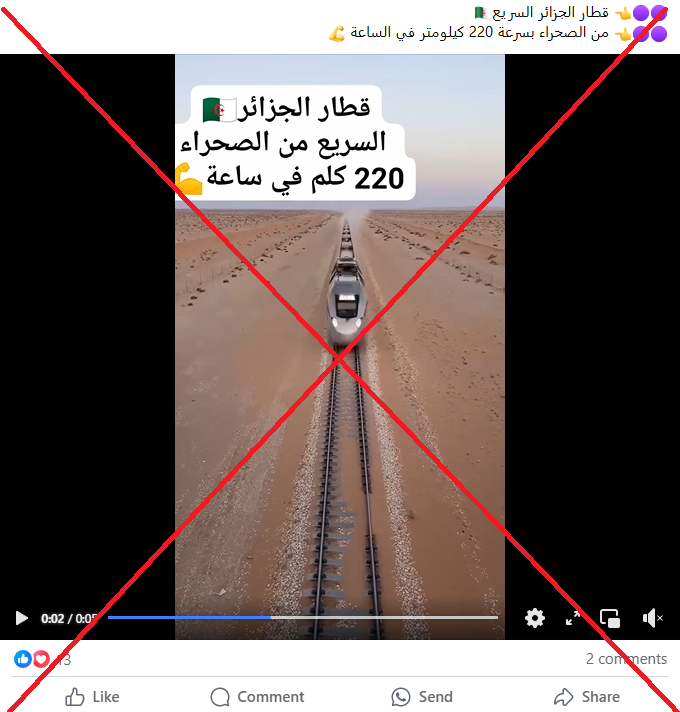 انتشر مؤخرًا على صفحات جزائرية في مواقع التواصل الاجتماعي فيديو يُظهر لحظة مرور قطار سريع وسط منطقة صحراوية. وقد تداول المستخدمون الفيديو على نطاق واسع، مع تعليقات تشير إلى أنه يُظهر “قطار الجزائر السريع من الصحراء”. لكن الحقيقة كانت مختلفة تمامًا.