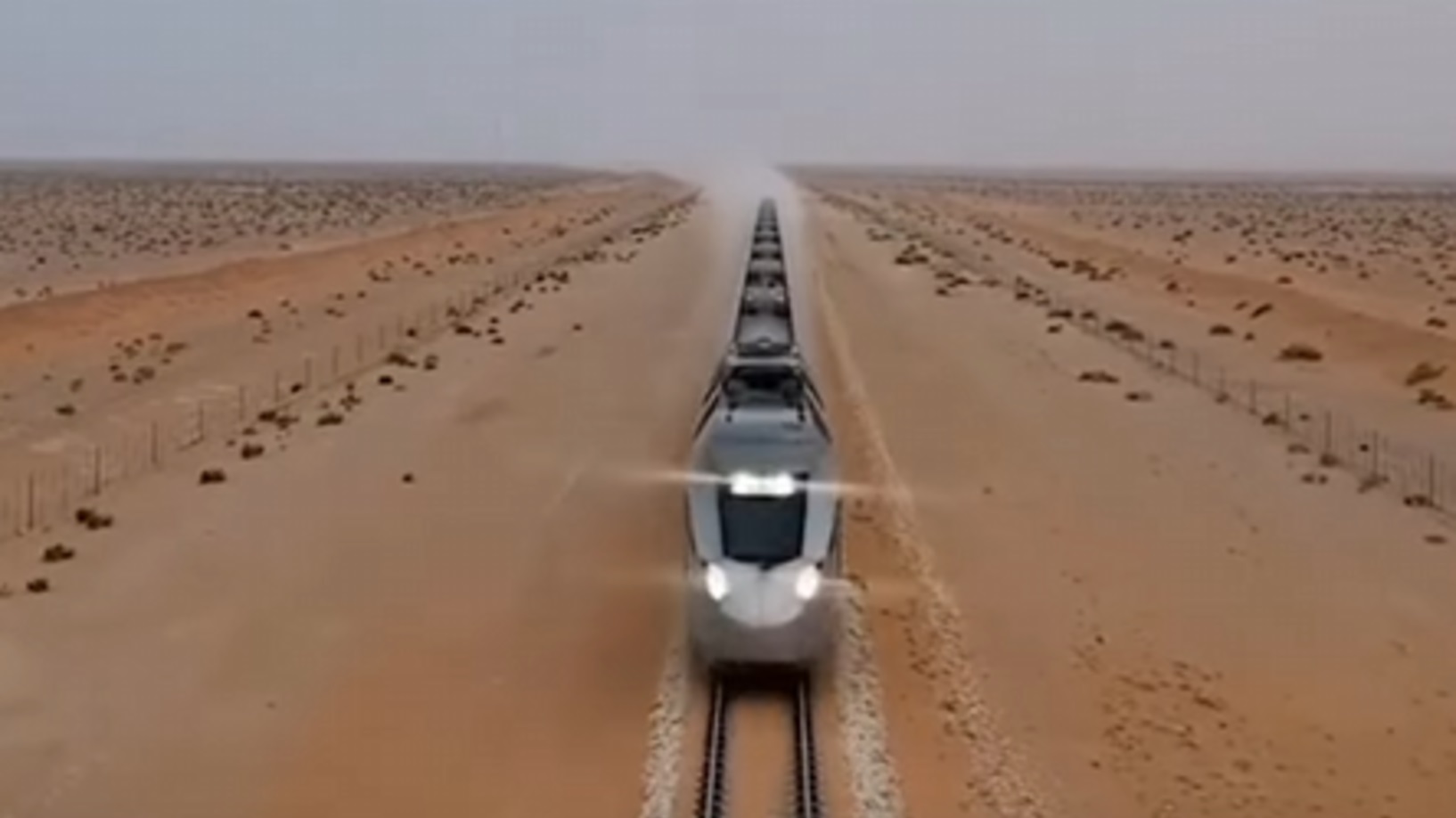 يظهر الفيديو قطارًا سريعًا يمر بسلاسة وسط مشهد صحراوي خلاب.