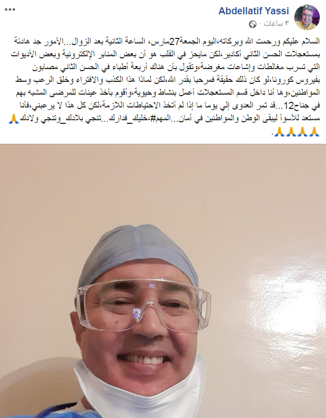 لكن ما حزَّ في قلب الأخصائي في طب المستعجلات والتسممات بالمركز الاستشفائي الحسن الثاني بأكادير هو أن بعض المنابر الإلكترونية وبعض الأديوات –المقاطع الصوتية- التي تسرب مغالطات وإشاعات مغرضة، وتقول بأن هناك أربعة أطباء في الحسن الثاني مصابون بفيروس كورونا، لو كان ذلك حقيقة فمرحبا بقدر الله، لكن لماذا هذا الكذب والافتراء وخلق الرعب وسط المواطنين”.