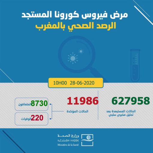 ارتفع عدد الإصابات بفيروس كورونا في المملكة المغربية اليوم الأحد 28 يونيو 2020، إلى حدود الساعة العاشرة صباحا، إلى 11986 حالة، حيث أفادت معطيات وزارة الصحة الرسمية تسجيل زيادة 109 حالات جديدة، ليرتفع إجمالي الإصابات التي تم تسجيلها إلى 11986 حالة مؤكدة.