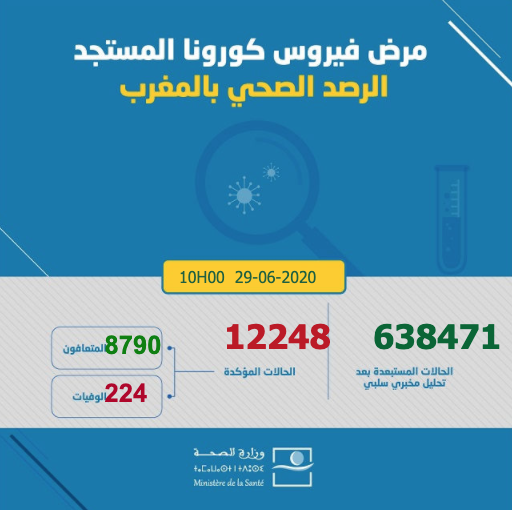 ارتفع عدد الإصابات بفيروس كورونا في المملكة المغربية اليوم الإثنين 29 يونيو 2020، إلى حدود الساعة العاشرة صباحا، إلى 12248 حالة، حيث أفادت معطيات وزارة الصحة الرسمية تسجيل زيادة 196 حالات جديدة، ليرتفع إجمالي الإصابات التي تم تسجيلها إلى 12248 حالة مؤكدة.