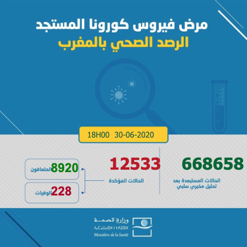 ارتفع عدد الإصابات بفيروس كورونا في المملكة المغربية اليوم الثلاثاء 30 يونيو 2020، إلى حدود الساعة السادسة مساء، إلى 12533 حالة، حيث أفادت معطيات وزارة الصحة الرسمية تسجيل زيادة 243 حالات جديدة، ليرتفع إجمالي الإصابات التي تم تسجيلها إلى 12533 حالة مؤكدة.