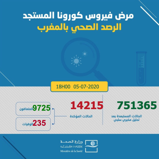 ارتفع عدد الإصابات بفيروس كورونا في المملكة المغربية اليوم الأحد 05 يوليوز 2020، إلى حدود الساعة السادسة مساء، إلى 14215 حالة، حيث أفادت معطيات وزارة الصحة الرسمية تسجيل زيادة 393 حالات جديدة، ليرتفع إجمالي الإصابات التي تم تسجيلها إلى 14215 حالة مؤكدة.