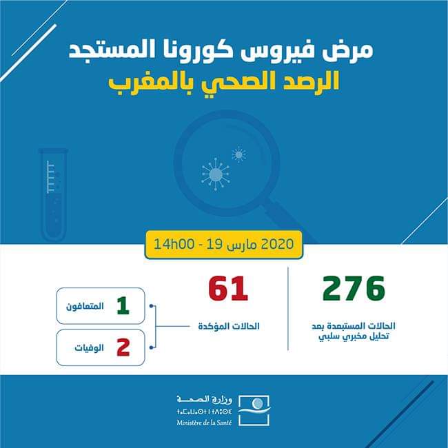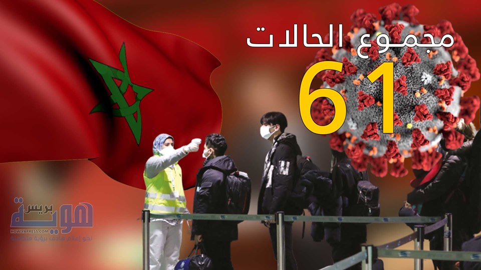 أعلنت وزارة الصحة عبر صفحتها الرسمية على الفايسبوك، أنه تم اليوم الخميس، تسجيل (3) حالات إصابة جديدة مؤكدة بفيروس كورونا المستجد، تم تأكيدها مخبريا بمعهد باستور-المغرب والمختبر الوطني للأنفلونزا والفيروسات التنفسية بالمعهد الوطني للصحة بالرباط، لصبح مجموع الحالات لحد هذا الإعلان 61 حالة.