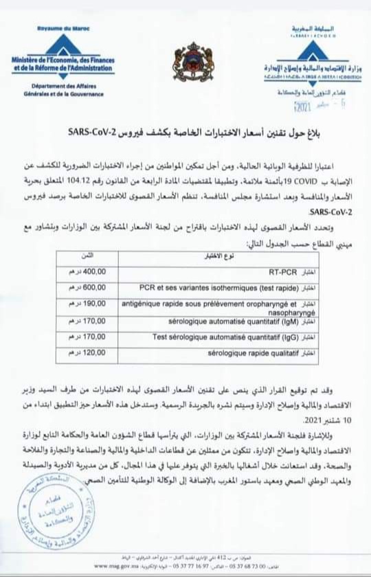 أعلنت وزارة الاقتصاد والمالية وإصلاح الإدارة عن تنظيم الأسعار القصوى لاختبارات الكشف عن فيروس Covid-19، وذلك بعد استشارة مجلس المنافسة باقتراح من لجنة الأسعار المشتركة بين الوزارات وبتشاور مع مهنيي القطاع”.
