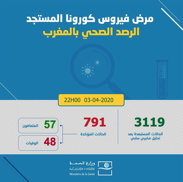 ارتفع عدد الإصابات بفيروس كورونا في المملكة المغربية اليوم الجمعة 03 أبريل 2020 إلى حدود الساعة العاشرة مساء، إلى 791 حالة، حيث أفادت معطيات وزارة الصحة الرسمية أن إجمالي الإصابات التي تم تسجيلها وصل إلى 791 حالة مؤكدة.