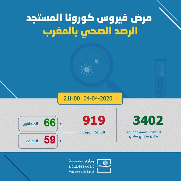 ارتفع عدد الإصابات بفيروس كورونا في المملكة المغربية اليوم السبت 04 أبريل 2020 إلى حدود الساعة التاسعة مساء، إلى 919 حالة، حيث أفادت معطيات وزارة الصحة الرسمية أن إجمالي الإصابات التي تم تسجيلها وصل إلى 919 حالة مؤكدة.
