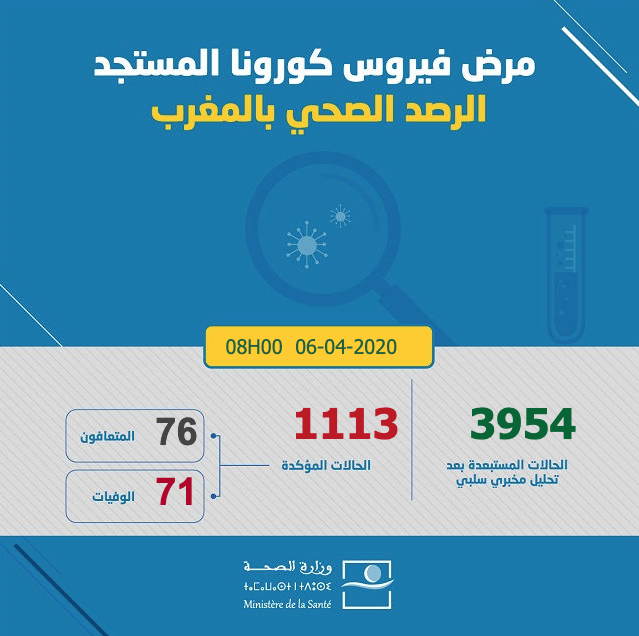 ارتفع عدد الإصابات بفيروس كورونا في المملكة المغربية اليوم الإثنين 06 أبريل 2020 إلى حدود الساعة الثامنة صباحا، إلى 1113 حالة، حيث أفادت معطيات وزارة الصحة الرسمية أن إجمالي الإصابات التي تم تسجيلها وصل إلى 1113 حالة مؤكدة.