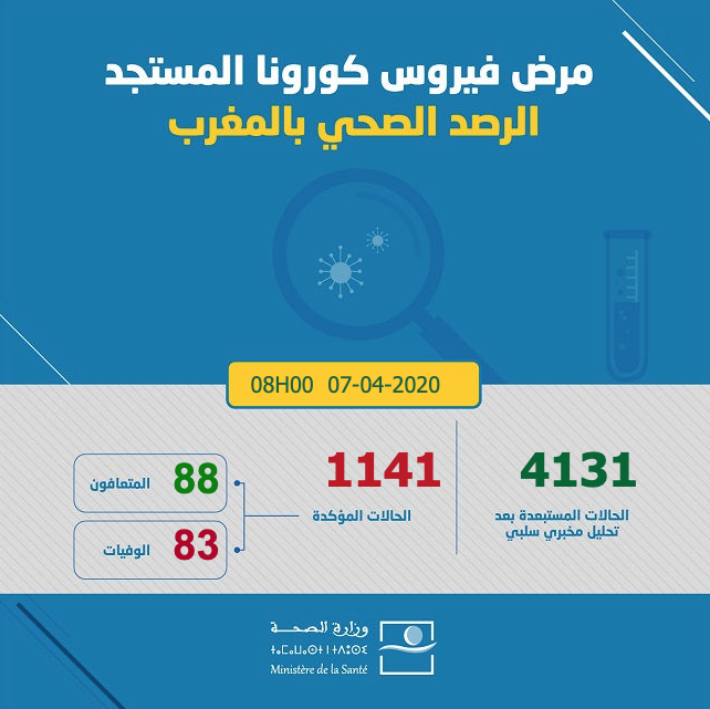 ارتفع عدد الإصابات بفيروس كورونا في المملكة المغربية اليوم الثلاثاء 07 أبريل 2020 إلى حدود الساعة الثامنة صباحا، إلى 1141 حالة، حيث أفادت معطيات وزارة الصحة الرسمية أن إجمالي الإصابات التي تم تسجيلها وصل إلى 1141 حالة مؤكدة.