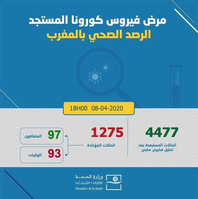 ارتفع عدد الإصابات بفيروس كورونا في المملكة المغربية اليوم الأربعاء 08 أبريل 2020 إلى حدود الساعة السادسة مساء، إلى 1275 حالة، حيث أفادت معطيات وزارة الصحة الرسمية أن إجمالي الإصابات التي تم تسجيلها وصل إلى 1275 حالة مؤكدة.