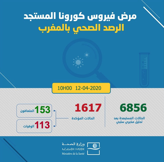 ارتفع عدد الإصابات بفيروس كورونا في المملكة المغربية اليوم الأحد 12 أبريل 2020 إلى حدود الساعة العاشرة صباحا، إلى 1617 حالة، حيث أفادت معطيات وزارة الصحة الرسمية أن إجمالي الإصابات التي تم تسجيلها وصل إلى 1617 حالة مؤكدة.
