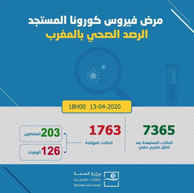 ارتفع عدد الإصابات بفيروس كورونا في المملكة المغربية اليوم الإثنين 13 أبريل 2020 إلى حدود الساعة السادسة مساء، إلى 1763 حالة، بعد تسجيل 102 حالة جديدة،حيث أفادت معطيات وزارة الصحة الرسمية أن إجمالي الإصابات التي تم تسجيلها وصل إلى 1763 حالة مؤكدة.