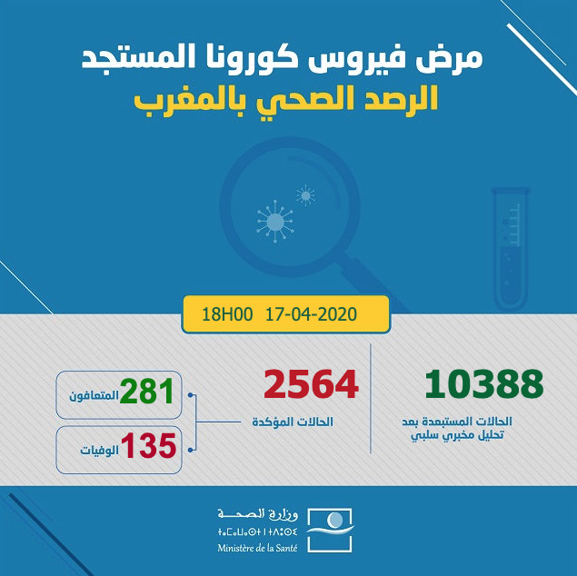 ارتفع عدد الإصابات بفيروس كورونا في المملكة المغربية اليوم الجمعة 17 أبريل 2020 إلى حدود الساعة السادسة مساء، إلى 2564 حالة، حيث أفادت معطيات وزارة الصحة الرسمية تسجيل زيادة ب 281 حالة جديدة، ليرتفع إجمالي الإصابات التي تم تسجيلها إلى 2564 حالة مؤكدة.