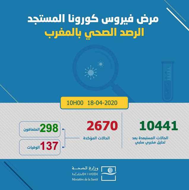 ارتفع عدد الإصابات بفيروس كورونا في المملكة المغربية اليوم السبت 18 أبريل 2020 إلى حدود الساعة العاشرة صباحا، إلى 2670 حالة، حيث أفادت معطيات وزارة الصحة الرسمية تسجيل زيادة ب 106 حالة جديدة، ليرتفع إجمالي الإصابات التي تم تسجيلها إلى 2670 حالة مؤكدة.