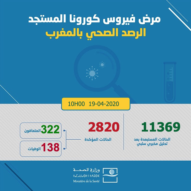ارتفع عدد الإصابات بفيروس كورونا في المملكة المغربية اليوم الأحد 19 أبريل 2020 إلى حدود الساعة العاشرة صباحا، إلى 2820 حالة، حيث أفادت معطيات وزارة الصحة الرسمية تسجيل زيادة ب 135 حالة جديدة، ليرتفع إجمالي الإصابات التي تم تسجيلها إلى 2820 حالة مؤكدة.