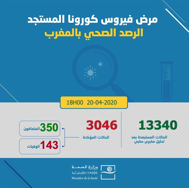 ارتفع عدد الإصابات بفيروس كورونا في المملكة المغربية اليوم الإثنين 20 أبريل 2020 إلى حدود الساعة السادسة مساء، إلى 3046 حالة، حيث أفادت معطيات وزارة الصحة الرسمية تسجيل زيادة ب 191 حالة جديدة، ليرتفع إجمالي الإصابات التي تم تسجيلها إلى 3046 حالة مؤكدة.