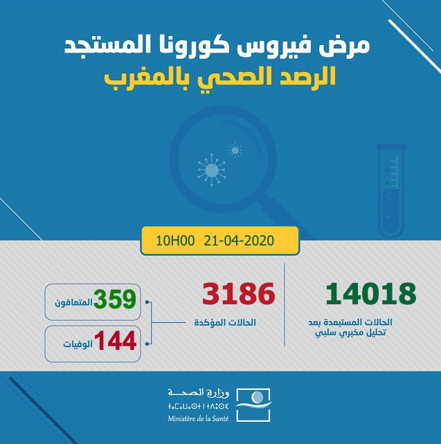 ارتفع عدد الإصابات بفيروس كورونا في المملكة المغربية اليوم الثلاثاء 21 أبريل 2020 إلى حدود الساعة العاشرة صباحا، إلى 3186 حالة، حيث أفادت معطيات وزارة الصحة الرسمية تسجيل زيادة ب 140 حالة جديدة، ليرتفع إجمالي الإصابات التي تم تسجيلها إلى 3186 حالة مؤكدة.