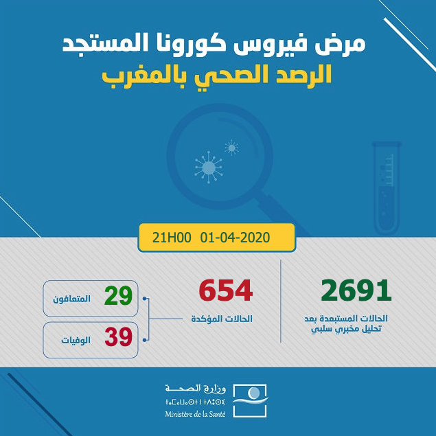 ارتفع عدد الإصابات بفيروس كورونا في المملكة المغربية اليوم الأربعاء 01 أبريل 2020 إلى حدود الساعة التاسعة مساء، إلى 654 حالة، حيث أفادت معطيات وزارة الصحة الرسمية أن إجمالي الإصابات التي تم تسجيلها وصل إلى 654 حالة مؤكدة.