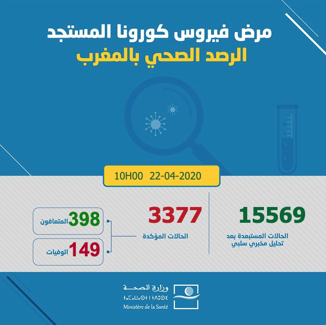 ارتفع عدد الإصابات بفيروس كورونا في المملكة المغربية اليوم الأربعاء 22 أبريل 2020 إلى حدود الساعة العاشرة صباحا، إلى 3377 حالة، حيث أفادت معطيات وزارة الصحة الرسمية تسجيل زيادة ب 168 حالة جديدة، ليرتفع إجمالي الإصابات التي تم تسجيلها إلى 3377 حالة مؤكدة.