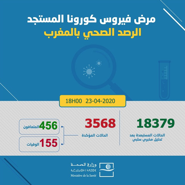 ارتفع عدد الإصابات بفيروس كورونا في المملكة المغربية اليوم الخميس 23 أبريل 2020 إلى حدود الساعة السادسة مساء، إلى 3568 حالة، حيث أفادت معطيات وزارة الصحة الرسمية تسجيل زيادة ب 122 حالة جديدة، ليرتفع إجمالي الإصابات التي تم تسجيلها إلى 3568 حالة مؤكدة.