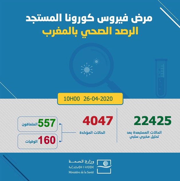 ارتفع عدد الإصابات بفيروس كورونا في المملكة المغربية اليوم الأحد 26 أبريل 2020، إلى حدود الساعة العاشرة صباحا، إلى 4047 حالة، حيث أفادت معطيات وزارة الصحة الرسمية تسجيل زيادة ب 150 حالة جديدة، ليرتفع إجمالي الإصابات التي تم تسجيلها إلى 4047 حالة مؤكدة.