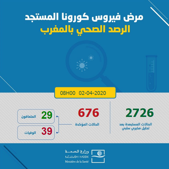 ارتفع عدد الإصابات بفيروس كورونا في المملكة المغربية اليوم الخميس 02 أبريل 2020 إلى حدود الساعة الثامنة صباحا، إلى 676حالة، حيث أفادت معطيات وزارة الصحة الرسمية أن إجمالي الإصابات التي تم تسجيلها وصل إلى 676حالة مؤكدة.