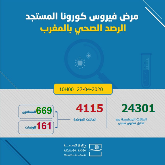 ارتفع عدد الإصابات بفيروس كورونا في المملكة المغربية اليوم الإثنين 27 أبريل 2020، إلى حدود الساعة العاشرة صباحا، إلى 4115 حالة، حيث أفادت معطيات وزارة الصحة الرسمية تسجيل زيادة ب 50 حالة جديدة، ليرتفع إجمالي الإصابات التي تم تسجيلها إلى 4115 حالة مؤكدة.