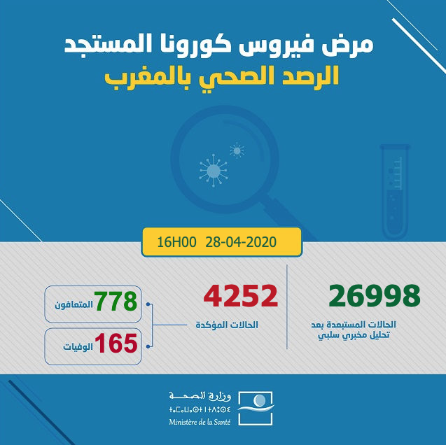 ارتفع عدد الإصابات بفيروس كورونا في المملكة المغربية اليوم الثلاثاء 28 أبريل 2020، إلى حدود الساعة الرابعة بعد الزوال، إلى 4252 حالة، حيث أفادت معطيات وزارة الصحة الرسمية تسجيل زيادة ب 132 حالة جديدة، ليرتفع إجمالي الإصابات التي تم تسجيلها إلى 4252 حالة مؤكدة.