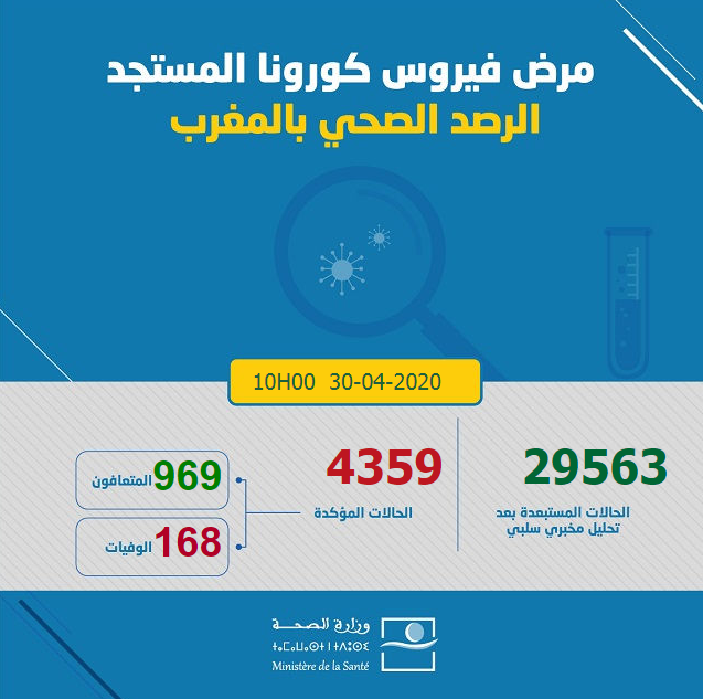 ارتفع عدد الإصابات بفيروس كورونا في المملكة المغربية اليوم الخميس 30 أبريل 2020، إلى حدود الساعة العاشرة صباحا، إلى 4359 حالة، حيث أفادت معطيات وزارة الصحة الرسمية تسجيل زيادة ب 38 حالة جديدة، ليرتفع إجمالي الإصابات التي تم تسجيلها إلى 4359 حالة مؤكدة.