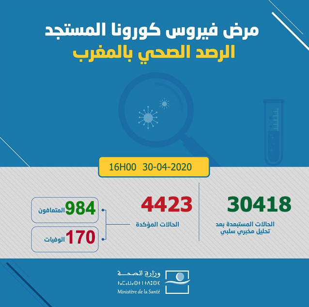 ارتفع عدد الإصابات بفيروس كورونا في المملكة المغربية اليوم الخميس 30 أبريل 2020، إلى حدود الساعة الرابعة بعد الزوال، إلى 4423 حالة، حيث أفادت معطيات وزارة الصحة الرسمية تسجيل زيادة ب 102 حالة جديدة، ليرتفع إجمالي الإصابات التي تم تسجيلها إلى 4423 حالة مؤكدة.