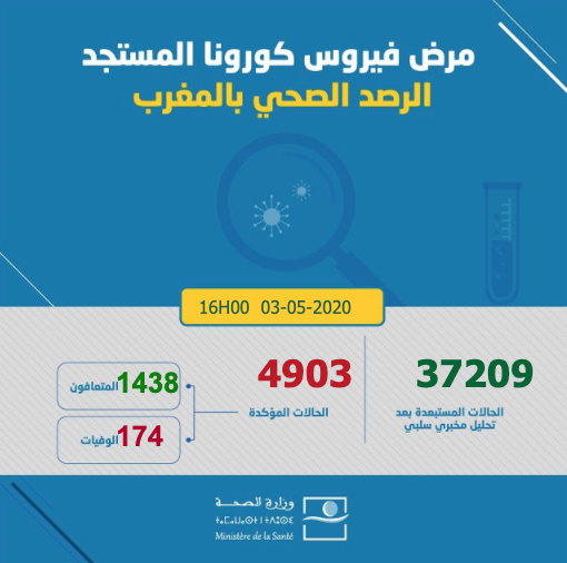 ارتفع عدد الإصابات بفيروس كورونا في المملكة المغربية اليوم الأحد 03 ماي 2020، إلى حدود الساعة الرابعة بعد الزوال، إلى 4903 حالة، حيث أفادت معطيات وزارة الصحة الرسمية تسجيل زيادة ب 174 حالة جديدة، ليرتفع إجمالي الإصابات التي تم تسجيلها إلى 4903 حالة مؤكدة.