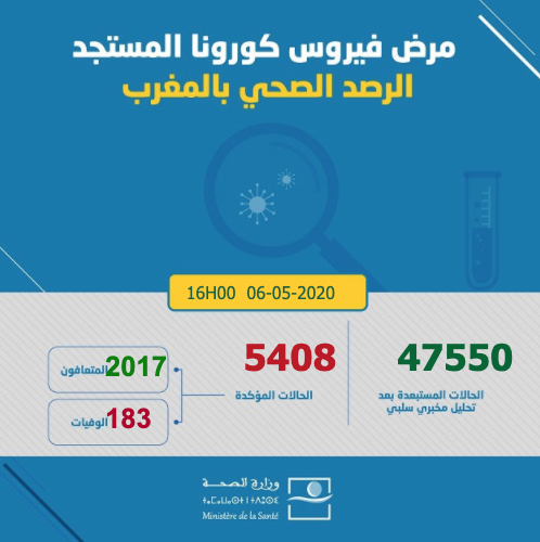 ارتفع عدد الإصابات بفيروس كورونا في المملكة المغربية اليوم الأربعاء 06 ماي 2020، إلى حدود الساعة الرابعة بعد الزوال، إلى 5408 حالة، حيث أفادت معطيات وزارة الصحة الرسمية تسجيل زيادة ب  189 حالة جديدة، ليرتفع إجمالي الإصابات التي تم تسجيلها إلى 5408 حالة مؤكدة.