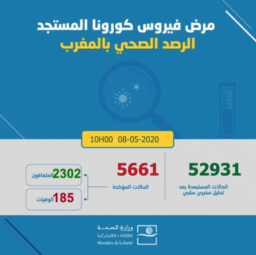 ارتفع عدد الإصابات بفيروس كورونا في المملكة المغربية اليوم الجمعة 07 ماي 2020، إلى حدود الساعة العاشرة صباحا، إلى 5661 حالة، حيث أفادت معطيات وزارة الصحة الرسمية تسجيل زيادة ب 113 حالة جديدة، ليرتفع إجمالي الإصابات التي تم تسجيلها إلى 5661 حالة مؤكدة.