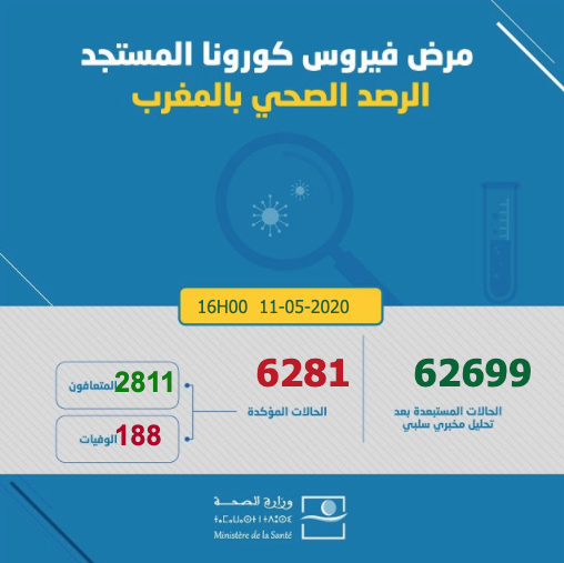 ارتفع عدد الإصابات بفيروس كورونا في المملكة المغربية اليوم الإثنين 11 ماي 2020، إلى حدود الساعة الرابعة بعد الزوال، إلى 6281 حالة، حيث أفادت معطيات وزارة الصحة الرسمية تسجيل زيادة ب 218 حالة جديدة، ليرتفع إجمالي الإصابات التي تم تسجيلها إلى 6281 حالة مؤكدة.