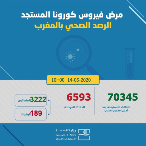 ارتفع عدد الإصابات بفيروس كورونا في المملكة المغربية اليوم الخميس 14 ماي 2020، إلى حدود الساعة العاش صباحا، إلى 6593 حالة، حيث أفادت معطيات وزارة الصحة الرسمية تسجيل زيادة ب 81 حالة جديدة، ليرتفع إجمالي الإصابات التي تم تسجيلها إلى 6593 حالة مؤكدة.