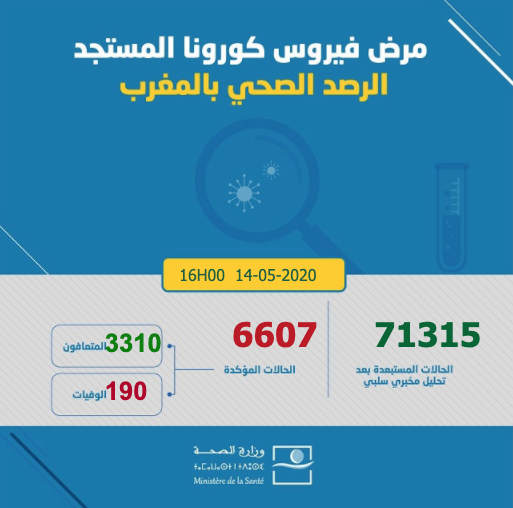 ارتفع عدد الإصابات بفيروس كورونا في المملكة المغربية اليوم الخميس 14 ماي 2020، إلى حدود الساعة الرابعة بعد الزوال، إلى 6607 حالة، حيث أفادت معطيات وزارة الصحة الرسمية تسجيل زيادة ب 95 حالة جديدة، ليرتفع إجمالي الإصابات التي تم تسجيلها إلى 6607 حالة مؤكدة.