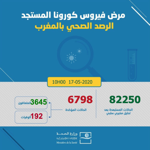 ارتفع عدد الإصابات بفيروس كورونا في المملكة المغربية اليوم الأحد 17 ماي 2020، إلى حدود الساعة العاشرة صباحا، إلى 6798 حالة، حيث أفادت معطيات وزارة الصحة الرسمية تسجيل زيادة ب 57 حالة جديدة، ليرتفع إجمالي الإصابات التي تم تسجيلها إلى 6798 حالة مؤكدة.